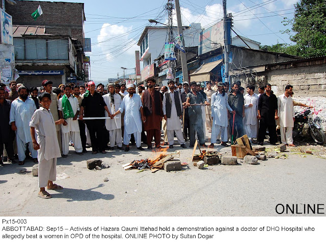 ایبٹ آباد:ڈی ایچ کیو ہسپتال کے ڈاکٹروں اور عملے کا اصل چہرہ سامنے آگیا۔ خاتون کے کپڑے پھاڑنے والے ڈاکٹر کی عدم گرفتاری پر ہزارہ قومی محاذ کے احتجاج کرنیوالے کارکنوں پر پتھروں اور ڈنڈوں سے حملہ ۔ متعدد افراد گھائل۔ حملے کرنیوالے اہلکاروں کیخلاف تھانہ کینٹ میں درخواست دے دی گئی۔ گرفتاری کے لئے چوبیس گھنٹوں کی ڈیڈ لائن۔ ڈی سی او اور ہسپتال انتظامیہ کیخلاف شدید نعرے بازی تفصیلات کے مطابق چند روز قبل ڈی ایچ کیو ہسپتال کی میڈیکل اوپی ڈی میں ڈاکٹر ارشدشاہ نے کیہال کی رہائشی روزینہ بی بی نامی خاتون کو گالیاں دیں اور مبینہ طور پر تشدد کرکے اس کے کپڑے پھاڑ دیئے۔ جس پر ہزارہ قومی محاذ کے کارکنوں نے جوابی کارروائی کرتے ہوئے ڈاکٹر ارشد شاہ کو مبینہ طور پر تشدد کا نشانہ بنایا۔ ڈاکٹر کی رپورٹ پر پولیس نے ہزارہ قومی محاذ کے نو کارکنوں کو گرفتار کرلیا۔ جواگلے روز ضمانتوں پر رہا ہوگئے۔ متاثرہ خاتون روزینہ بی بی نے ڈاکٹر ارشد شاہ کیخلاف پولیس کو درخواست دی تھی۔ جس پر پولیس نے کوئی کارروائی نہیں کی اور نہ ہی ڈاکٹر کو گرفتار کیا گیا۔ہفتہ کے روز ہزارہ قومی محاذ کے کارکنوں نے ڈاکٹر ارشد شاہ کی گرفتاری کے لئے احتجاجی مظاہرہ کیا۔ مظاہرین نے ڈی ایچ کیو ہسپتال کے مین گیٹ کے سامنے احتجاجی کیمپ لگاکر نعرے بازی شروع کردی۔ اسی اثناء میں ڈی ایچ کیو ہسپتال کے ڈاکٹروں اور پیرا میڈیکس نے ہزارہ قومی محاذ کے کارکنوں پر پتھراؤ شروع کردیا۔ جس پر ہسپتال کا مین گیٹ میدان جنگ بن گیا۔ لنک روڈ پر ہر قسم کی ٹریفک معطل رہی۔ ڈی ایچ کیو ہسپتال کے عملے نے ہزارہ قومی محاذ کے کارکنوں پر حملہ کرکے انہیں تشدد کا نشانہ بنایا۔ دونوں اطراف سے لاتوں مکوں اور ڈنڈوں کا آزادنہ استعمال کیا گیا۔ پولیس نے موقع پر پہنچ کر حالات کو قابو میں کیا۔ اس موقع پر ہزارہ قومی محاذ کے چیئرمین قاضی اظہر ایڈوکیٹ نے ڈی ایچ کیو ہسپتال کے عملے کے حملے کیخلاف تھانہ کینٹ میں مقدمہ درج کرنے کی درخواست دائر کردی ہے۔ جن میں پیرا میڈیکس کے لیڈر قاضی تنویر، معروف اور دیگر دو ڈاکٹروں کو نامزد کیا گیا ہے۔ اور ان لوگوں کی گرفتاری کے لئے چوبیس گھنٹوں کی ڈیڈ لائن دی ہے۔ مذکورہ افراد کی عدم گرفتاری پر ہزارہ قومی محاذ کے کارکنوں نے زبردست احتجاج کا اعلان کیا ہے۔